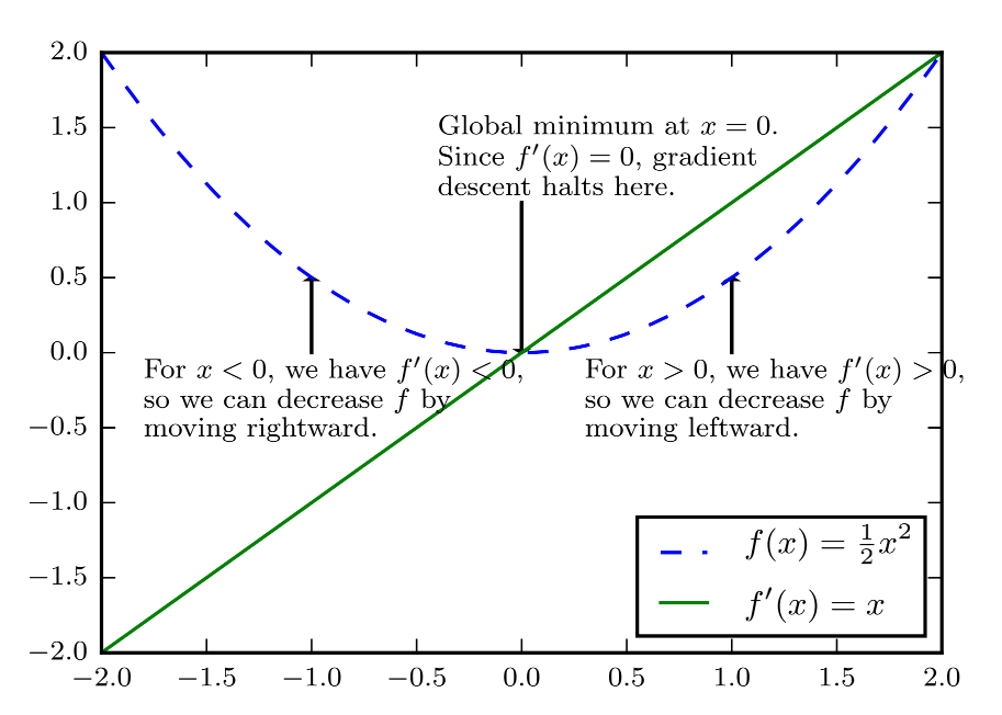 梯度下降(Gradient Descent) [2][3]: 梯度下降简单来说就是一种寻找目标函数最小化的方法,导数对于最小化一个函数很有用,代表更改$x$来略微改善$y$,因此可以将$x$往导数的反方向移动一小步来减小$f(x)$,这种技术称为梯度下降。如图所示,梯度下降算法,沿着函数的下坡方向(导数反方向)直到最小。