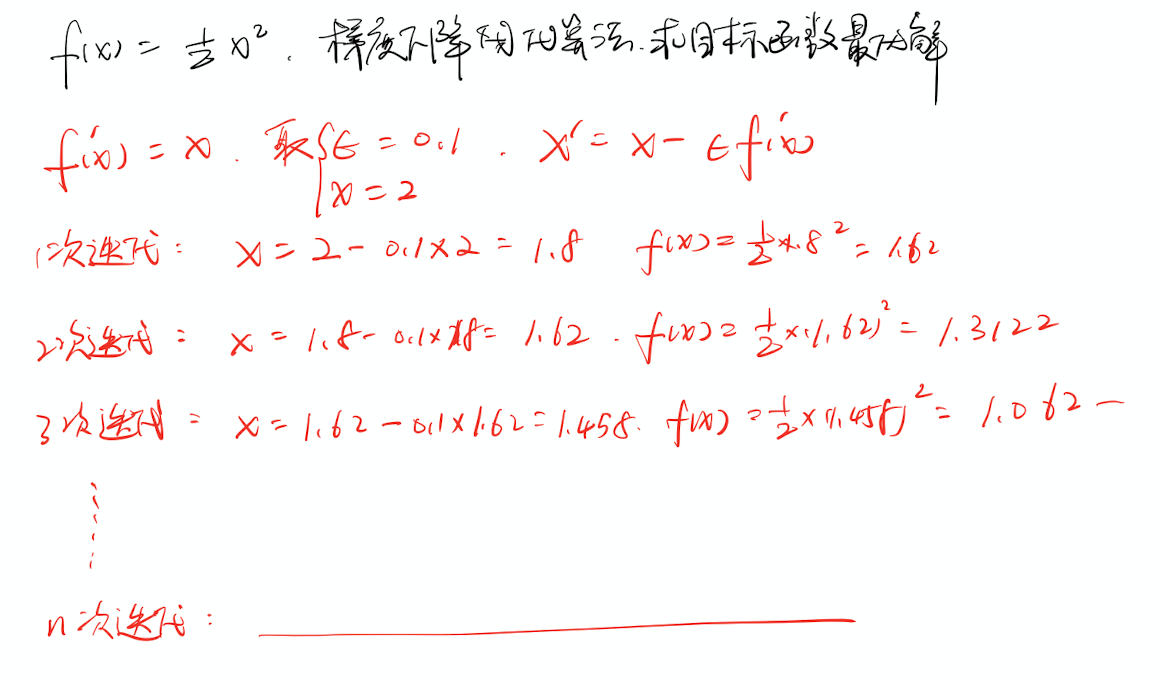 其中$\epsilon$为学习率(Learning Rate),是一个确定步长大小的正标量。$\epsilon$的选择方法:选择一个小常数;根据几个$\epsilon$计算$x’$,选择能产生最小目标函数值的$\epsilon$,称为在线搜索。