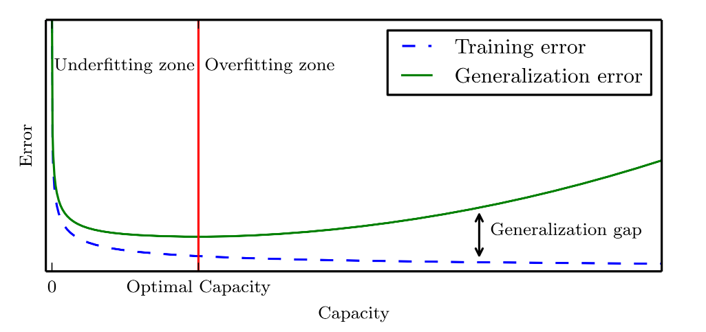 通常,当模型容量上升时,训练误差会下降,直到其渐近最小可能误差(假设误差度量有最小值)。通常,泛化误差是一个关于模型容量的U形曲线函数。如图所示,容量和误差之间的关系,左侧训练误差和泛化误差都非常高,为欠拟合机制。当容量增加时,训练误差减小,但训练误差和泛化误差之间的间距扩大,当间距的大小超过了训练误差的下降,则进入到了过拟合机制,其中容量过大,超过了最佳容量。