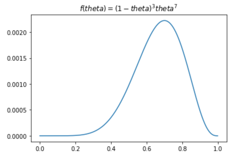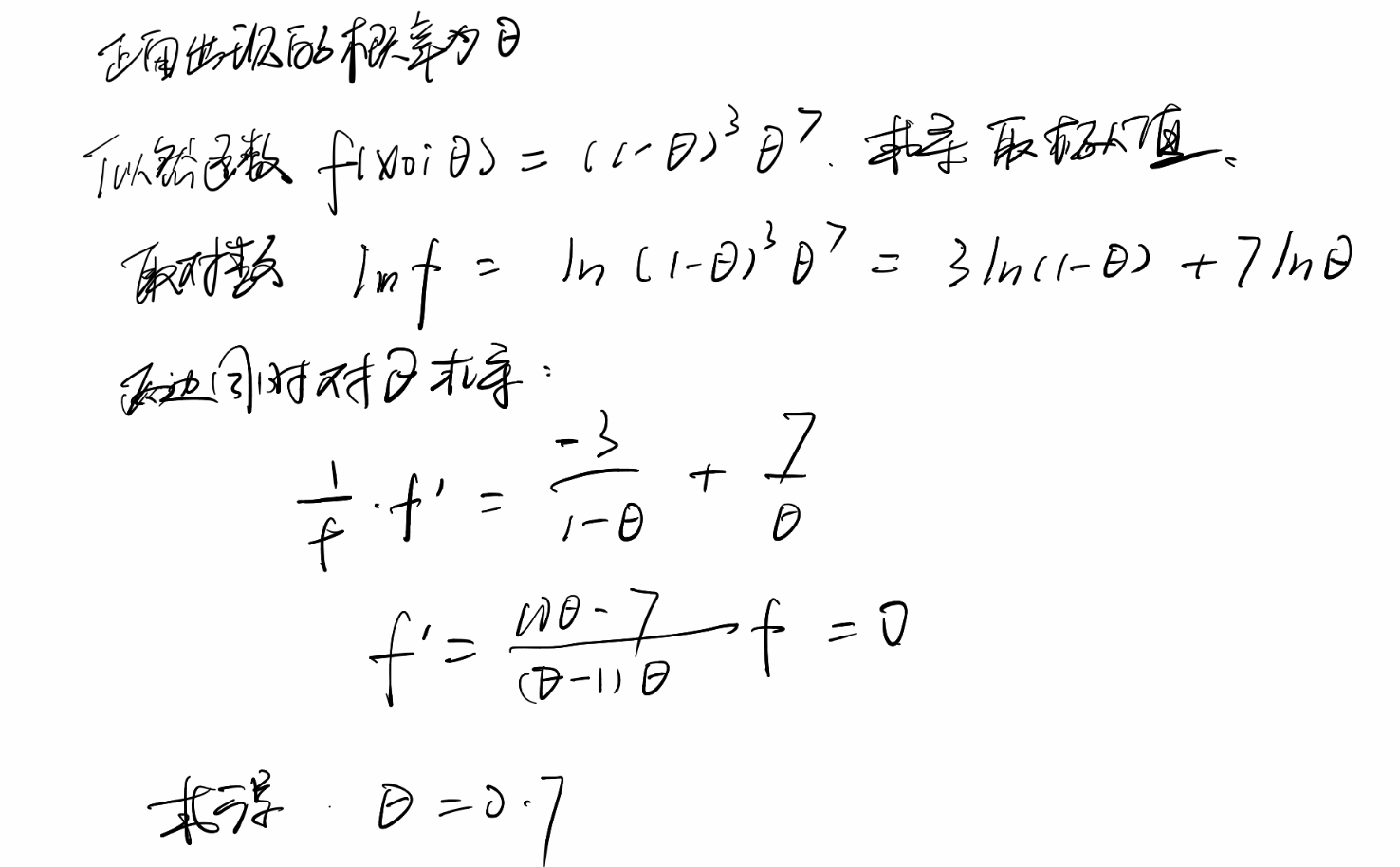 一枚硬币抛10次,得到$X$数据为{反,正,正,正,正,反,正,正,正,反}。得到似然函数$f(x_{0};\theta)=(1-\theta)\times\theta\times\theta\times\theta\times\theta\times(1-\theta)\times\theta\times\theta\times\theta\times(1-\theta)=(1-\theta)^{3}\times \theta ^{7}$