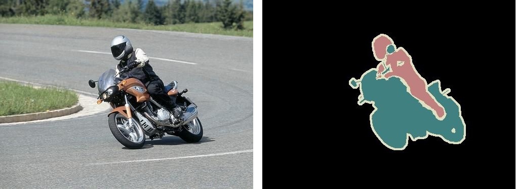 语义分割(Semantic Segmentation)是图像处理和机器视觉一个重要分支,其目标是精确理解图像场景与内容。语义分割是在像素级别上的分类,属于同一类的像素都要被归为一类,因此语义分割是从像素级别来理解图像的。如下如所示的照片,属于人的像素部分划分成一类,属于摩托车的像素划分成一类,背景像素划分为一类。