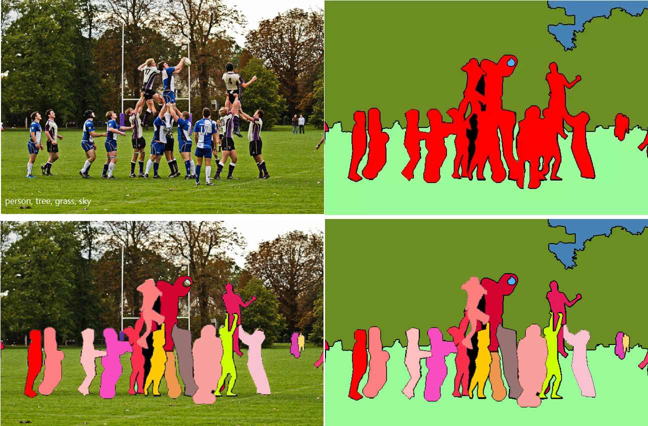 - 全景分割(panoptic segmentation):语义分割和实例分割的结合,即要对所有目标都检测出来,又要区分出同个类别中的不同实例。